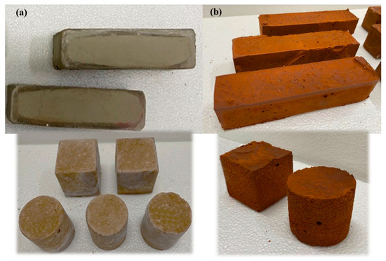 The alkaline activator solution was prepared by mixing sodium silicate solution (SS) with 10 M sodium hydroxide solution (N). The weight ratio SS/N/binder was 1:1:3. The activator/binder ratio was fixed at 0.66 for all the mixtures. Both the experimental parameters and the procedure used to manufacture the geocomposites were properly selected and optimized from previous studies [16,28]. For each waste, three mixtures were prepared using 0, 10 or 20% of fly ashes as partial replacement. Specimens were prepared in three different geometries according to the specific requirements of the European standards for physical and mechanical characterization (see Figure 2):
