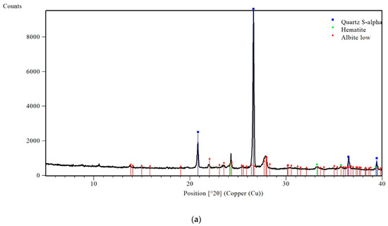 The mineralogical composition was evaluated by XRD analysis on a powder sample using a Panalytical X’Pert Pro diffractometer equipped with a PixCel 1D detector (operative conditions: CuKa1/Ka2 radiation, 40 kV, 40 mA, 2θ range from 5 to 80, step size 0.0131 2θ, counting time 40 s per step). X-ray fluorescence spectroscopy (XRF; AXIOS Panalytical Instrument; Malvern PANalytical, Almelo, The Netherlands) has been performed to determine the chemical composition of samples in the form of pressed pellets.