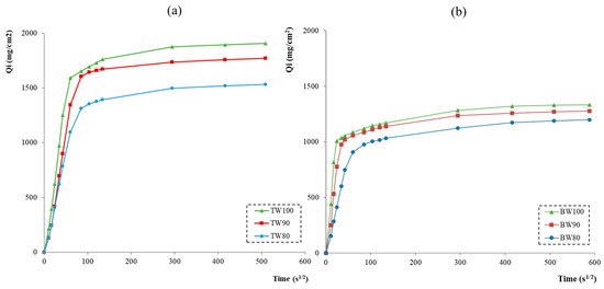 Average values of capillary water absorption (Q) in function of time for (a) TW-based and (b) BW-based geocomposites.