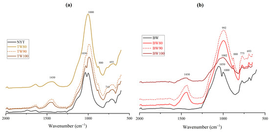 FTIR spectra for (a) NYT and TW-based geopolymers and for (b) BW and BW-based geopolymers.