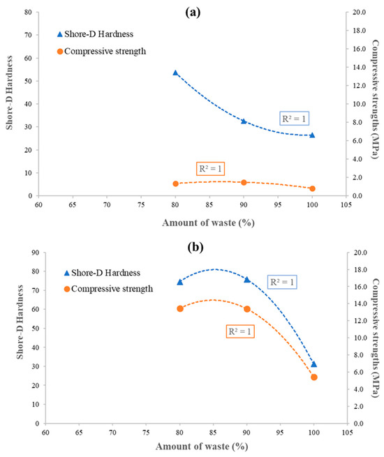 Correlation between amount of waste, Shore-D hardness and compressive strength for (a) TW-based and (b) BW-based geocomposites.