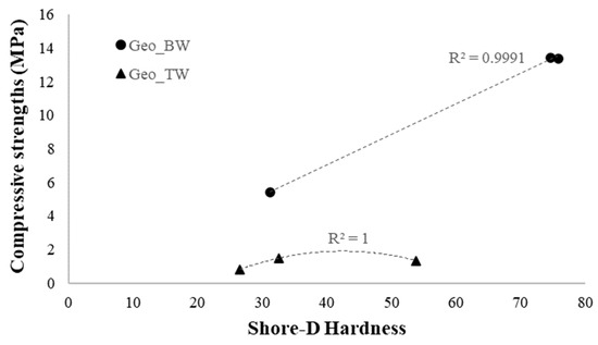 Figure 7 shows the relationship between compressive strength and Shore-D hardness of all the geocomposites. For the BW-based geopolymers, compressive strengths are linearly correlated to the hardness value, with a correlation coefficient R2 ≈ 1, while the data of the TW-based samples do not follow a linear relationship, but a second-degree polynomial function (R2 = 1). This suggests that the typical methods of using hardness testing to estimate the strength may not be applicable to TW-based geocomposites.