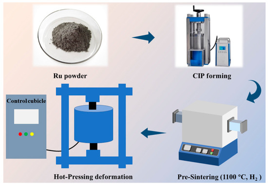 The fabrication of ruthenium (Ru) targets was carried out using commercially available Ru powder (purity 99.99%; Sino-Platinum Metals Co., Ltd., Kunming, China) as the starting powder. The Ru powder was subjected to cold isostatic pressing (CIP) at a pressure of 250 MPa in a 6 mm diameter polyurethane mold. This process led to the formation of green bodies. These green bodies were pre-sintered at a temperature of 1100 °C for 0.5 h under a hydrogen atmosphere. Eventually, the Ru targets were obtained by hot press sintering the pre-sintered bodies at pressures of 5, 10, 20, 30 and 40 MPa and a temperature of 1400 °C, under a vacuum of 10−2 Pa for 0.5 h in a graphite mold, which had an inner diameter of 15 mm. The Ru targets were subsequently ground and polished for performance analysis. The preparation process of the Ru target is illustrated in Figure 1 through a schematic diagram.