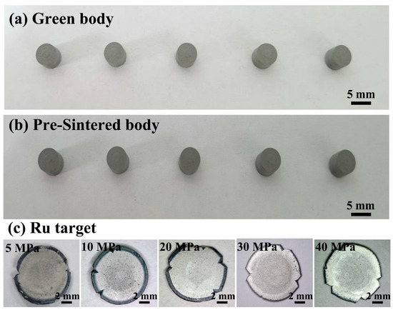 (a) Green bodies (cold isostatic pressing), (b) pre-sintered bodies (1100 °C, H2), and (c) Ru targets (hot-pressing deformation).