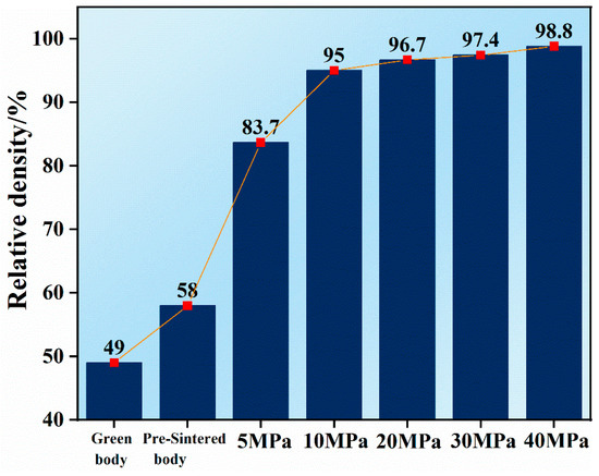 The relative density of samples significantly changed with the change in appearance, diameter and height. Figure 4 shows the relative density of green bodies, pre-sintered bodies and Ru targets following hot-pressing deformation at 5–40 MPa. The green body exhibited a relative density of 49%, whereas the pre-sintered body demonstrated a relative density of 58%. As the hot-pressing pressure increased from 5 MPa to 40 MPa, the relative density of the Ru target increased from 83.7% to 98.8%. The high relative density of up to 98.8% indicates high densification, which is the highest density of Ru target reported until now [2,5,27]. Therefore, hot-pressing deformation is a novel effective strategy for densifying refractory metals via powder metallurgy.