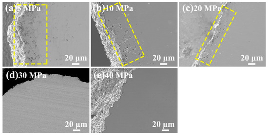 The microstructure of the edge of Ru targets that underwent hot-pressing deformation at 5–40 MPa is presented in Figure 5. The edge region of Ru targets that underwent hot-pressing deformation at 5, 10 and 20 MPa exhibited numerous fine pores, indicating incomplete densification and lower density. The relative densities of these Ru targets were measured to be 83.7%, 95% and 96.7%, respectively, which were largely lower than the theoretical density due to the presence of numerous fine pores at the edge region. The depth of the edge region containing pores decreased with increasing hot-pressing pressure from 5 MPa to 20 MPa. When the hot-pressing pressure exceeded 30 MPa, the depth of the edge region containing larger pores approached zero. These results suggest that hot-pressing pressures below 20 MPa are insufficient to drive plastic deformation at 1400 °C. Higher hot-pressing pressures above 30 MPa are required to achieve rapid plastic deformation and densification. The density at the edge region increases with increasing hot-pressing pressure. As shown in Figure 5, Ru targets that underwent hot-pressing deformation at 40 MPa exhibit a very smooth and dense microstructure at the edge region.
