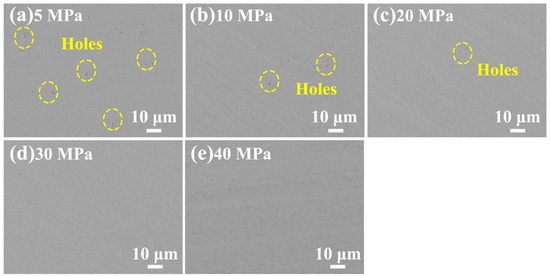 During the hot-pressing deformation process, cylindrical samples underwent a transformation from a cylindrical shape to a disk shape due to a decrease in height and an increase in diameter. This transformation resulted in the formation of distinct microstructures between the central and edge regions. The microstructure of the central region of Ru targets following hot-pressing deformation at 5–40 MPa is depicted in Figure 6. As compared with the edge microstructure shown in Figure 5, the central region of Ru targets exhibited a significantly denser microstructure than its edge region due to the hot-pressing deformation. However, the central region of Ru targets, following hot-pressing deformation at 5, 10 and 20 MPa, still contained small amounts of fine pores, indicating incomplete densification. The quantity of these fine pores in the central region of Ru targets decreased as the hot-pressing pressure increased from 5 MPa to 20 MPa, suggesting that increasing pressure improves densification. No pores were observed in the central region of Ru targets following hot-pressing deformation at 30 MPa and 40 MPa. This result indicates that when the hot-pressing pressure exceeded 30 MPa, the central region of Ru targets achieved nearly full density.