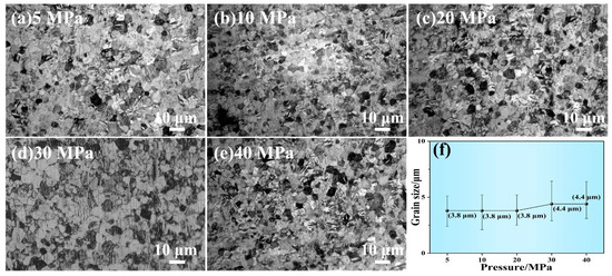 Hot-pressing deformation is a reliable technique for preventing rapid grain growth and achieving a refined microstructure. Figure 7a–e shows the etched microstructure in the central region of Ru targets that underwent hot-pressing deformation at pressures ranging from 5 MPa to 40 MPa. The microstructure of Ru targets following hot-pressing deformation at 5–40 MPa all exhibit a fine-grained structure, with no coarse or abnormal growth grains observed. Figure 7f demonstrates how the hot-pressing deformation pressure affects the average grain size of Ru targets. The average grain size of Ru targets following hot-pressing deformation at 5–20 MPa is around 3.8 μm, while the average grain size of Ru targets following hot-pressing deformation at 30–40 MPa is around 4.4 μm. As a result, fine-grained Ru targets are obtained.