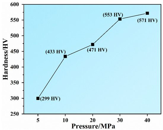 The Vickers hardness of Ru targets following hot-pressing deformation at 5–40 MPa.