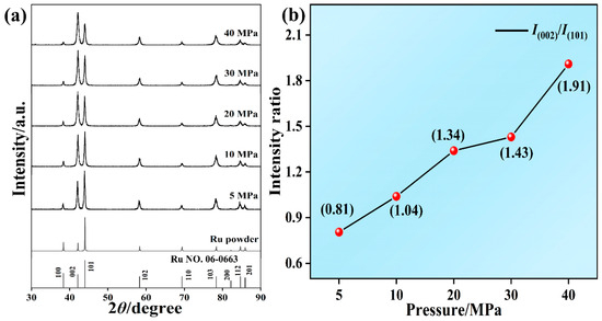 X-ray diffraction patterns (a) and the (002)/(101) peak intensity ratios (b) of Ru targets following hot-pressing deformation at 5–40 MPa.