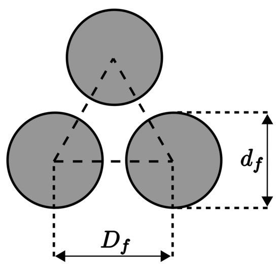 The permeability modelling strongly depends on the cross-section fibre arrangement, typically performed by empirical evaluations from stochastic distributions obtained using laboratory measurements or numerical simulations. Another possible approach is the assumption of repetitive distribution and theoretical simplifications, such as those performed, e.g., by Gebart []. This last approach was used in this work with the hexagonal arrangement of the fibres, where each fibre is surrounded by six other equally spaced fibres. Despite the rough simplification, this will allow the study of other parameters, including fibre displacement and extrusion die geometry, which is the main goal of this work. The porous medium is schematised in Figure 1 considering its main geometric dimensions, namely, the fibres’ nominal diameter and the distance between their geometric centres .