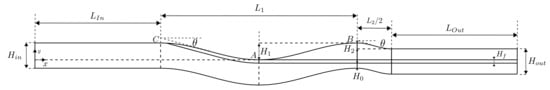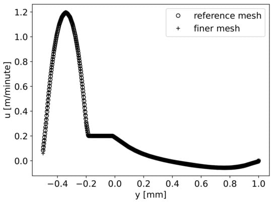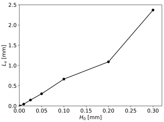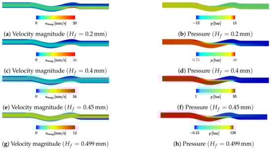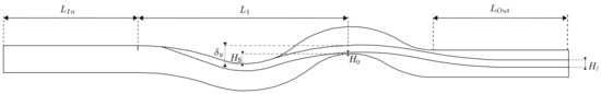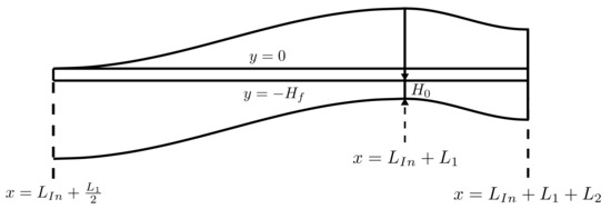 Specifying that the fibres should be equally spaced from the top and bottom walls at the output, one can obtain , leading to the definition of from the values of and , i.e., . It can be seen that and ; therefore, . In this work, we considered the height of . The height of the first wave was set to , leading to . The lengths and are defined as five times the height of the channel, i.e., . From the value and using Equation (11), the value is derived. Since is a function of the gap , and this depends on , the length also varies with . Using Equation (5), one can obtain the minimum thickness of the fibres layer . Several numerical simulations can be performed by varying the values of and , allowing the analysis of each parameter’s influence on the polymer flow through the die geometry.
