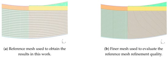 As a first attempt, the geometry with the fibres’ thickness layer , the horizontal and vertical lines were discretised with elements of in length and elements along the fibres layer were considered with . This reference mesh has around cells ( hexahedrons and 7941 prisms). A finer mesh was defined, dividing the previous elements’ length by , leading to a mesh around two times the number of elements.