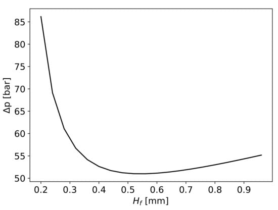 The calculated gap for varying from 0.15 to 0.5 mm (Equation (21)) is presented in Figure 17 as well as the required pressure drop needed to fully impregnate the fibres. There is a close relation between the gap’s height, which assures the required pressure drop to fibres’ impregnation to a given , and the required pressure drop itself.