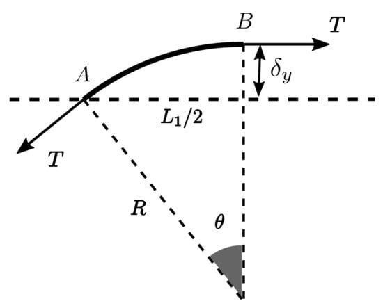 To analyse the fibre displacement and the applied tension, it was considered that the deformation of the fibres promoted by the pressure differential can be approximated by an arc of circumference between point A and point B, with radius R and angle (see Figure 8).