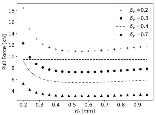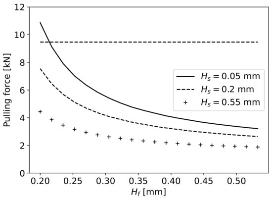 For a given value of , the that the fibre should present for each to determine the required for full impregnation is obtained, and with , the required pulling force can be calculated in relation to (Equation (17)). In Figure 19, the pulling force in relation to for different values of is presented. The value of was selected to allow an appropriate pulling force of fibres for any given value between 0.2 () and 0.5 mm (). In the final proposed geometry, the values of , , and are kept constant, varying the maximum slope of the curves to achieve the desired value of .