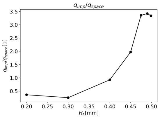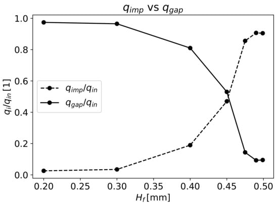 It can be observed that the polymer fully flows through the gap until the value of . After this point, aiming to decrease and consequently increase in the gap, the polymer flow through the fibres increases exponentially. The definition of a narrow working zone for correct fibre impregnation at the value of 0.4 means only of the polymer flows through the fibres, and when , the whole polymer flows through the fibres.