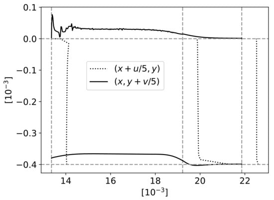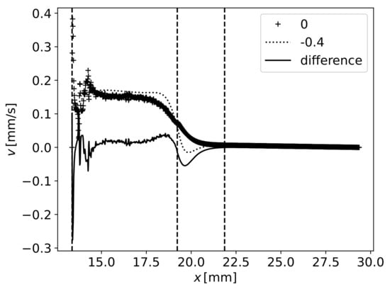 Figure 15 has the same reference vertical dashed lines as Figure 14 and horizontal lines at the fibres’ top and bottom limits. The velocity components were represented next to these lines, with a scale factor of , to better understand the global left-to-right movement as well as the difference that enables the mass conservation balanced with the vertical velocity component. After (point B), there is an expansion under the fibres’ region, leading to a pressure drop that induces a downward movement of the polymer.