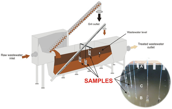Twelve AISI 304 stainless steel test specimens, four in each zone (A, B and C), were suspended from polyethylene ropes attached to the frame of the screenings and grit separator below the protective covers (Figure 1). Samples from the A-series were not in direct contact with the wastewater. The B-series samples were half-submerged in wastewater and periodically fully submerged at higher effluent flows through the screenings and grit separator. The C-series samples were submerged in wastewater. After 18 months of exposure, the samples were pulled out and the sediment accumulated on the surface was subjected to microbiological and microscopic (EDX) analysis. After having been cleaned, the samples were subjected to microscopic examination, and weight loss was determined.
