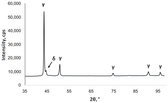 Characteristics of the material used for the study. X-ray diffraction pattern of stainless steel 304 sample (δ—ferrite, γ—austenite).