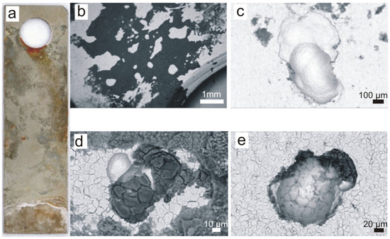 A-series sample after 18 months of exposure: (a) macroscopic image, (b) deposit near the sample suspension hole, (c) largest pitting found on the surface of the sample measuring 615 × 736 µm, (d) pitting with deposit, (e) pitting without deposit. Scale bars: 1 mm (b), 100 μm (c), 10 μm (d), 20 μm (e).