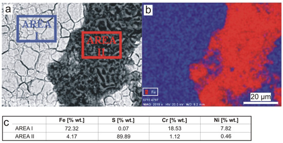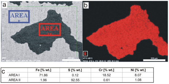 The results of the surface chemical composition analysis presented in Figure 4 show that the dark areas are dominated by sulfur, whose content in the examined area (AREA II in Figure 4a and red area in Figure 4b) was determined to be 89.89% by weight. Analysis of the chemical composition of the substrate material showed the typical content of the main alloying elements for 304 steel, i.e., chromium (18.53 wt.%) and nickel (7.82 wt.%) (Figure 4c).