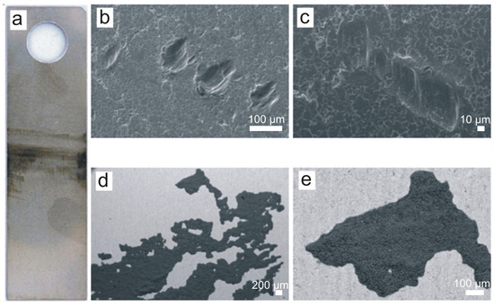 B-series sample after 18 months of exposure: (a) macroscopic image, (b,c) microscopic images with minor surface defects of a mechanical damage nature, (d,e) deposit. Scale bars: 100 μm (b), 10 μm (c), 200 μm (d), 100 μm (e).