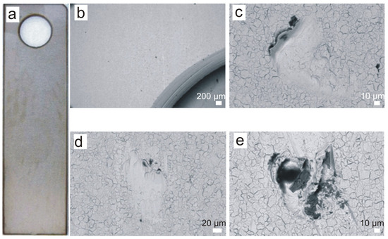 C-series sample after 18 months of exposure: (a) macroscopic image, (b) area near the sample hanging hole, (c,d) areas with small surface defects of a mechanical damage nature, (e) defect with a small amount of sediment. Scale bars: 200 μm (b), 10 μm (c), 20 μm (d), 10 μm (e).