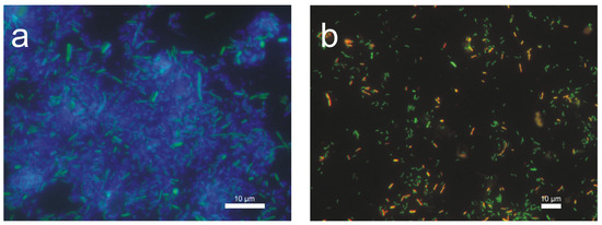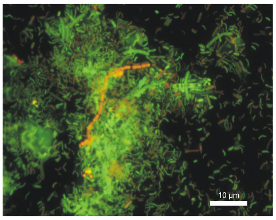 Sulfate- and sulfur-reducing bacteria (SRB), as well as filamentous bacteria, are mainly responsible for the decomposition of sulfur-containing organic compounds, while the course of oxidation and reduction processes depends on the conditions that bacteria need for growth [2]. The Live/DEAD staining confirmed the presence of living bacteria, filamentous bacteria and protozoa in the sludge taken from the B- and C-series samples submerged in wastewater flowing into the grit separator. Figure 8 depicts most of the living bacteria from the B-series.