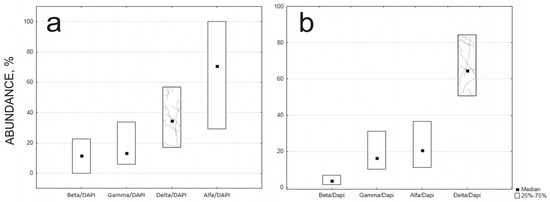 For the quantitative analysis, 15 images, each of sediment stained with general probe, specific probe and DAPI reagent, were taken sequentially. Analyses were performed for 4 specific probes twice. A total of 360 images were taken. A Nikon Eclipse Ni-E C2 confocal microscope and NIS-Elements AR 4.30 software were used for the analysis. The appropriate threshold (the level of fluorescence corresponding to the presence of the probe’s signal) was then defined for each probe. In this procedure, binary images were obtained for which fluorescent areas were automatically counted. After determining the area of fluorescence, the percentage ratio of a specific probe area to DAPI was calculated [19,20]. In this way, 15 different percentage ratios were obtained, for which medians and percentiles of 25–75% were defined in Statistica 13.3. The analysis of wastewater was performed in the same way.
