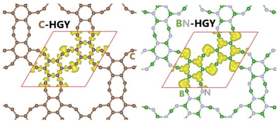 Top view of the C- and BN-HGY monolayers’ fully planar crystal structures along with the ELF isosurface of 0.75 plotted within the unit cell area using the VESTA [40] software. Here, the horizontal and vertical directions represent X and Y directions, respectively.