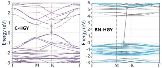 In order to investigate the electronic properties of the C- and BN-HGY monolayers, we carried out the electronic band structure calculations using PBE/GGA and HSE06 functionals, which are illustrated in Figure 2. The C-HGY monolayer is found to be a direct gap semiconductor with band gaps of 1.00 (0.50) eV, according to the HSE06(PBE) functional occurring at point K. The predicted electronic band gaps of the C-HGY monolayer match excellently with a recent theoretical report [38]. In contrast with the native C-HGY lattice, the BN-HGY monolayer is found to be an indirect gap insulator with a large band gaps of 5.58 (4.20) eV, according to the HSE06(PBE) methods. These findings are consistent with the semimetallic and insulating electronic nature of pristine and suspended graphene and h-BN native lattices. In the BN-HGY monolayer, the valance band maximum (VBM) and conduction band minimum (CBM) appear with almost flat dispersions, which suggest low carrier mobilities and high insulating features of this system. In the original C-HGY lattice, nonetheless, the VBM and CBM appear with rather sharp dispersions, which have been proven to result in outstanding carrier mobilities [25,38].