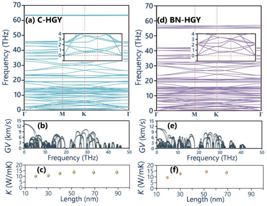 (a) Phonon dispersion relations of the (a) C- and (d) BN-HGY monolayers; here, insets show the zoomed view of low-frequency phonon modes. (Predicted phonons’ group velocity (GV) of the single-layer (b) C- and (e) BN-HGY. (c,f) Length-dependent phononic thermal conductivity (κ) the room temperature.