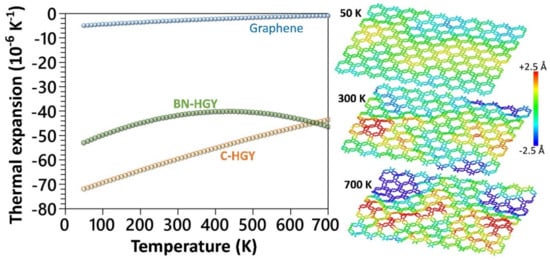 We now examine the thermal expansion behavior using the developed MLIP-based classical models. The temperature dependency of the thermal expansion coefficients was evaluated based on the relation, where A denotes the projected area at a given temperature of T [42,43]. To obtain the aforementioned relation, six independent calculations with uncorrelated initial velocities were carried out over systems with 2400 atoms, and subsequently for each structure the projected areas at every temperature were averaged and a polynomial curve was fitted to report the thermal expansion coefficients [42]. The details of the MTP-based molecular dynamics calculations are fully given in our earlier study [42]. In Figure 4, the thermal expansion coefficients of the single-layer C- and BN-HGY are compared with those of the graphene [42]. The thermal expansion coefficients of the suspended C-HGY, BN-HGY and graphene monolayers at room temperature were predicted to be −59.7, −41.8 and −2.9 × 10−6 K−1 [42], respectively, which shows one order of magnitude larger negative thermal expansion of these novel 2D lattices. As illustrated in Figure 4, for the atomic structures of the C-HGY lattice at 50, 300 and 500 K, it is noticeable that at low temperatures, this nanosheet presents a fairly flat configuration; however, at higher temperatures, due to presence of nanoporous lattice and low bending rigidity, it undergoes substantial out-of-plane wrinkles. The substantial formation of wrinkles at higher temperatures results in the shrinkage of the projected area of the sheet and subsequently, appears with ultrahigh negative thermal expansion coefficients [42].