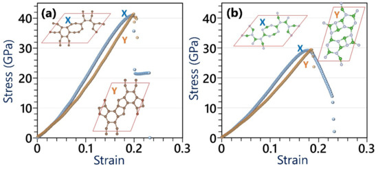 We finally explore the mechanical properties of the C- and BN-HGY monolayers using the DFT method, assuming a constant thickness of 3.6 Å during the entire mechanical loading, to report the stress values in the GPa unit. In Figure 5, the uniaxial stress–strain curves of the considered lattices are plotted. The elastic modulus was acquired by fitting linear curves to stress–strain values under 0.01 stress. According to the presented DFT results, although marginal mismatches are observable in the stress–strain curves along the X and Y directions, both systems exhibit convincingly isotropic elasticity and ultimate tensile strength. The elastic modulus (ultimate tensile strength) values of the single-layer C- and BN-HGY are predicted to be 127(41) and 105(29) GPa, respectively. It is worth mentioning that according to the Griffth theory [44], the elastic modulus to ultimate tensile strength ratio should be around 10, which for the pristine graphene, MoS2 and silicene monolayers was reported to be 8 [4], ~11 [45], and ~9 [46], respectively. As an interesting behavior, the aforementioned ratio for the C- and BN-HGY monolayers is around 3. In Figure 5 insets, we also compared the failure mechanism, which revealed that along the X direction, the first bond breakages occur within hexagonal rings’ bonds, oriented exactly along the loading on the boundary of nanopore, suddenly suppressing the load bearing ability of the systems and resulting in conspicuous sharp stress drops. On the other side, for both considered lattices under uniaxial loading along the Y direction, as it can be seen from Figure 5 insets, the structural transformations occur after passing the tensile strength point (strain levels around 0.2), resulting in structural instabilities and lack of clear bond breakages.