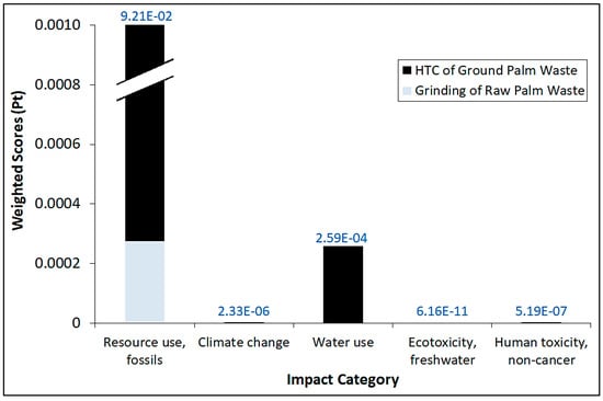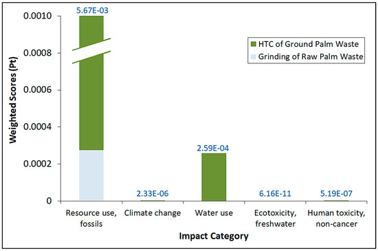 | HTC of ground palm waste | Fossil resource scarcity | ReCiPe Midpoint (H) 2016 | 1569.58 kg oil eq. |