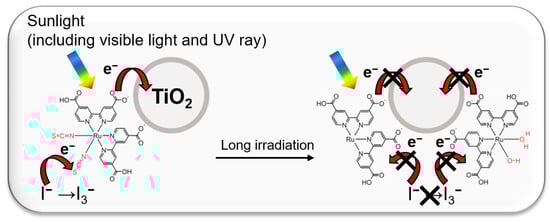 The schematic illustration of the interaction between N719 and TiO2 through carboxylate and the surface of TiO2, and the conventional DSSC degradation mechanism by long irradiation.