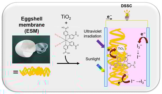 As a solution to the problem, we focused on the structure of eggshell membrane (ESM). ESM, which has been generally discarded as an unwanted byproduct of egg consumption worldwide, is a waste product with enormous energy potential []. ESM has the hydrophobic structure composition of collagen-like proteins with organic substituents, such as hydroxyl, amine and sulfonic groups [], resulting in ESM being applied to fuel cells as an insoluble proton-conducting membrane through their substituents [,,]. Recently, ESMs have been utilized as low-cost and available biotemplates for the preparation of inorganic nanomaterials [,,,,] and adsorbents for the removal of water pollutants [,], due to their good adsorption of organic materials and metal ions [,] into the hydrophobic cavity. These applications contribute as a simultaneous solution to environmental issues and decrease in waste []. Furthermore, it is expected that ESM can serve as a functional material to immobilize dyes in DSSCs, because of its adsorption ability in hydrophobic cavity. As demonstrated in a recent report on solar cells containing biomaterials [] such as mycobacterial protein (conversion efficiency η: 1%) [], bamboo (η: 5.4%) [], chitosan (η: 1.8%) [] and spinach (retention of max current density after irradiation: 77.78%) [], the use of biomaterials may be critical to the development of a new class of sustainable and greener solar cells.