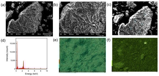 SEM images of ESM powder, magnification of 500 (a) and 1000 (b). Elemental analysis area of Ca in ESM (five light blue points 001, 002, 003, 004, and 005; (c) EDX spectrum at the position 001 (d). EDX mapping of the N719-adsorbed ESM-TiO2 composite; Ru (e) and Ti (f).