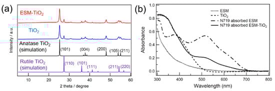 (a) XRD patterns of the ESM-TiO2 composite, TiO2, and simulated data of TiO2 (database identifier: ICSD 9852 (anatase), ICSD 23697 (rutile)). (b) UV-vis spectra for ESM, TiO2, the N719-adsorbed ESM and the N719-adsorbed ESM-TiO2 composite.
