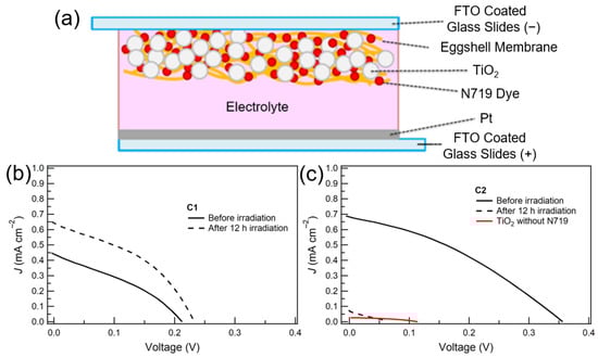 The photovoltaic performances of DSSCs were evaluated using the illustrated structure in Figure 5a, and the J-V curves of the C1 and C2 were obtained before and after 12 h irradiation, respectively (Figure 5b,c). Although C1 exhibited lower photocurrent densities and voltages than C2, before irradiation, the photovoltaic performances of C1 were higher than those of C2 after 12 h irradiation. The activation, the gradual resistance-decrease process, might occur in C1 during irradiation [], enhancing the photovoltaic performances after 12 h irradiation in C1. In addition, Table 2 and Table 3 show the photovoltaic performances, short-circuit photocurrent densities JSC, open-circuit voltages VOC, fill factors (FF) and power conversion efficiencies (PCE) of C1 and C2 before and after irradiation, respectively. Before irradiation, C1 and C2 showed a JSC of 0.441 and 0.682 mA cm−2, a VOC of 0.212 and 0.356 V, a FF of 0.337 and 0.347 and a PCE of 0.005 and 0.10%, respectively. On the other hand, after irradiation, C1 and C2 showed a JSC of 0.643 and 0.071 mA cm−2, a VOC of 0.232 and 0.063 V, a FF of 0.347 and 0.223 and a PCE of 0.008 and 0.001%, respectively. It was revealed that ESM-composition improved the photovoltaic stability, although the photocurrent densities and voltages were lower.