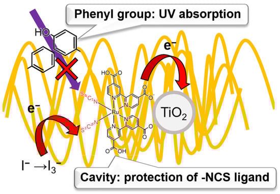 Renewable energies, such as solar, wind, wave and hydro power, have attracted much attention as the solution to increasing energy and environmental concerns []. Among them, dye-sensitized solar cells (DSSCs), one of the most promising technologies to convert sunlight into electricity, have been intensely developed due to their lower cost and easier fabrication [,]. The typical DSSC, which is composed of a working electrode with dye chemically attached to anatase-TiO2, a counter electrode, and electrolyte solution including redox mediator I−/I3−, operates under the following principles []: First, the dyes inject electrons into the conduction band of anatase-TiO2 upon their excitation by incident light. Second, the injected electrons are transported to the counter electrode through a wire, and then the redox mediator I3− is reduced to I− on the counter electrode. Finally, the excited dye then returns to its original state by accepting electrons from the redox mediator I− on the working electrode. As mentioned above, the metal oxide layers, such as anatase-TiO2 and ZnO, play an important role in improving the performance of DSSCs by immobilizing dyes through the interaction between the ligands of dyes and oxygen on the metal oxides [,,]. In the conventional DSSCs, N719 ([RuL2(NCS)2]•2TBA (L = 2,2′-bipyridyl-4-4,4′-dicarboxylic acid; TBA = tetra-n-butylammonium) [,] have been used as dyes with the ligands (-COO− and -NCS) interacting with oxygen on the surface of TiO2 and acting as modulators of the voltages of DSSCs. [,,]. The -COO− group, the major linker to oxygen on TiO2 surface, injects electron into the conduction band of TiO2 from N719 and elevates the lowest unoccupied molecular orbital (LUMO) energy of N719 [,]. The -NCS group, which is the minor linker to the TiO2 surface, retrieves electron from a redox mediator and lowers the highest occupied molecular orbital (HOMO) energy [,]. This HOMO-LUMO gap modulation determines the absorption wavelength between 300 and 800 nm, resulting in the DSSCs exhibiting a high voltage of 0.7 V []. However, the -NCS ligand has been removed from Ru2+ in N719 by UV irradiation and exchanged with H2O or OH− in electrolyte, resulting in a drop in voltage and photocurrent density [,,,] (Figure 1). A low-cost and simple solution has also been required for wider application of DSSCs. This suggests that the problem in DSSC technology can be solved by a low-cost system to protect the -NCS ligand of N719.