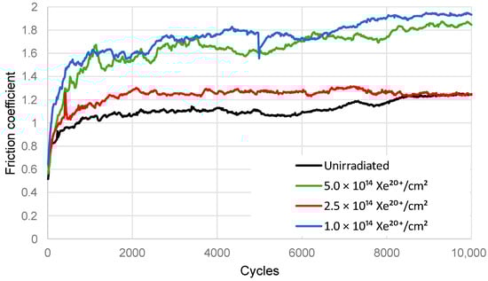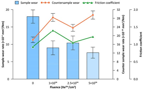 - Budzynski, P.; Kaminski, M.; Surowiec, Z.; Wiertel, M.; Skuratov, V.A.; Korneeva, E.A. Effects of xenon-ion irradiation on the tribological properties and crystal structure of titanium and its alloy Ti6Al4V. Tribol. Int. 2021, 156, 106854. [Google Scholar] [CrossRef]