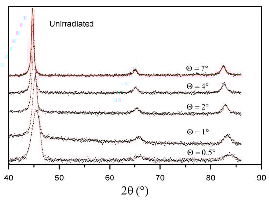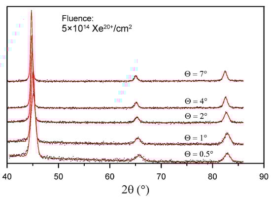 | Fluence/ Incidence Angle Θ (°) | Unirradiated | 1 × 1014 Xe20+/cm2 | 2.5 × 1014 Xe20+/cm2 | 5 × 1014 Xe20+/cm2 | ||||
