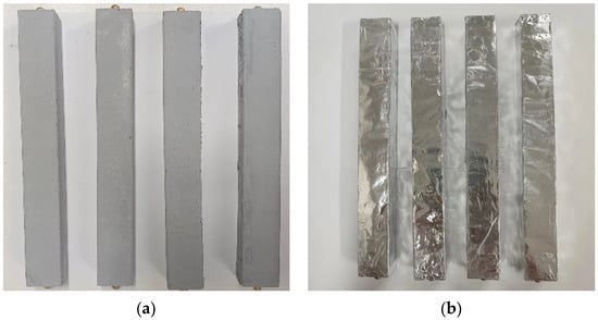 The shrinkage measurement under sealed conditions followed the methods described in references [53,54]. The dimensions of the test specimens were uniformly set at 25 mm × 25 mm × 280 mm. After being cured under standard conditions for 24 h, the specimens were demolded and then immersed in water for 48 h. After removal from the water, the surfaces were carefully wiped to eliminate any moisture and impurities from the copper nails on both sides. The initial length was measured using a length comparator. Then, the specimens were sealed by wrapping them with double-layered aluminum foil and paraffin, as shown in Figure 1b, to ensure that the internal moisture of the mortar did not evaporate or dissipate into the surroundings.