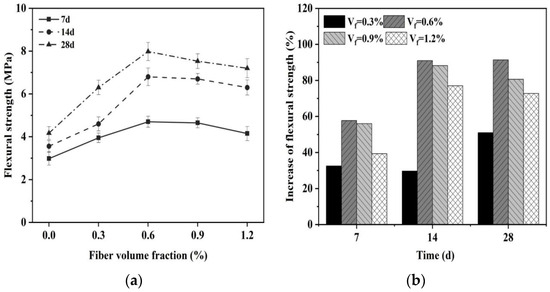 Effect of fiber content on flexural strength of magnesium silicate cement mortar. (a) Flexural strength and (b) increase in flexural strength.