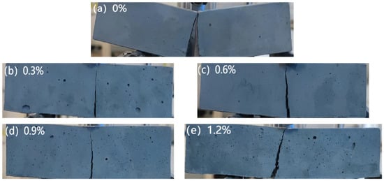 Cracking of MgO-SiO2-H2O mortar specimens with different fiber contents after 28 d flexural test.