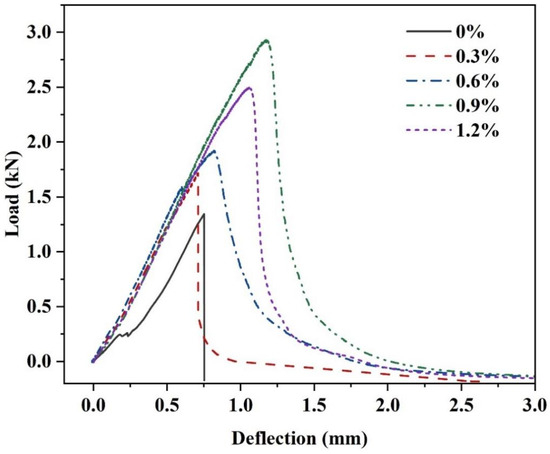 The incorporation of glass fibers can affect the post-failure morphology of the MgO-SiO2-H2O cement. As shown in Figure 3, the specimens without fibers exhibit clear brittle failure, with the specimens splitting into two halves upon reaching failure. Conversely, the specimens with fibers exhibit crack formation during failure but do not split into two halves, indicating that the brittleness of failure has improved. The load–deflection curves obtained from the three-point bending tests of fiber reinforced with varying fiber contents (Figure 4) reveal that the control group without fibers experiences a rapid decrease in load and fast crack propagation leading to failure upon reaching the maximum deflection value, indicating brittle failure. However, there is a slight increase in both peak load and deflection after the addition of fibers, with the load–deflection curve initially displaying a linear relationship. And after reaching the peak load, the load gradually decreases, suggesting that specimens with added glass fibers exhibit ductile fractures.