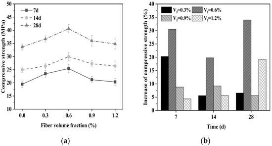 Effect of fiber content on compressive strength of magnesium silicate cement mortar. (a) Compressive strength and (b) increase in compressive strength.
