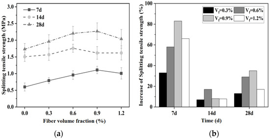 Effect of fiber content on splitting tensile strength of magnesium silicate cement mortar: (a) splitting tensile strength and (b) increase in strength.